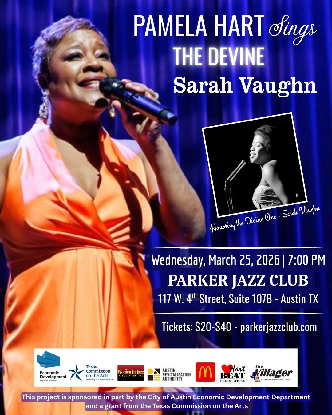 Austin’s First Lady of Jazz, Pamela Hart, brings the music of Sarah Vaughn to life with elegance, power, and deep respect for the legacy on one jazz’s most influential women.